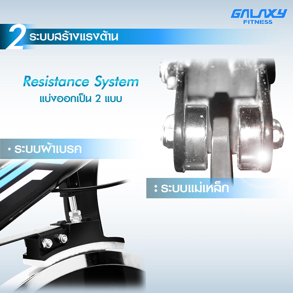 2.2 ระบบแม่เหล็ก (Magnetic Resistance) เป็นระบบที่พัฒนาขึ้นใหม่ สร้างแรงต้านด้วยแม่เหล็กกำลังสูง เมื่อผู้ใช้ต้องการปรับแรงต้านให้มากขึ้น ก็คือปรับตัวแม่เหล็กให้เข้าใกล้จานล้อจักรยานมากขึ้น ข้อดีคือ ไม่มีเสียง เพราะไม่มีการเสียดสี ไม่ต้องเปลี่ยนอะไหล่ตัวสร้างแรงต้าน และ ความรู้สึกที่นุ่มนวลเวลาปั่น อย่างไรก็ตาม จักรยานแม่เหล็กจะมีราคาแพงกว่า และ สร้างแรงต้านได้น้อยกว่าแบบผ้าเบรค รวมถึงระบบต่างๆ จะไม่แข็งแรงเท่าระบบผ้าเบรค